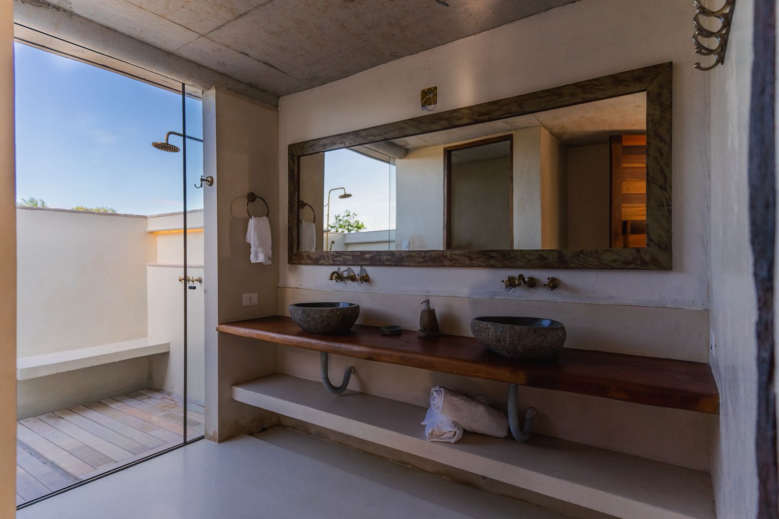 – Casa principal com 2 suítes amplas, banheiros espaçosos e chuveiros ao ar livre.