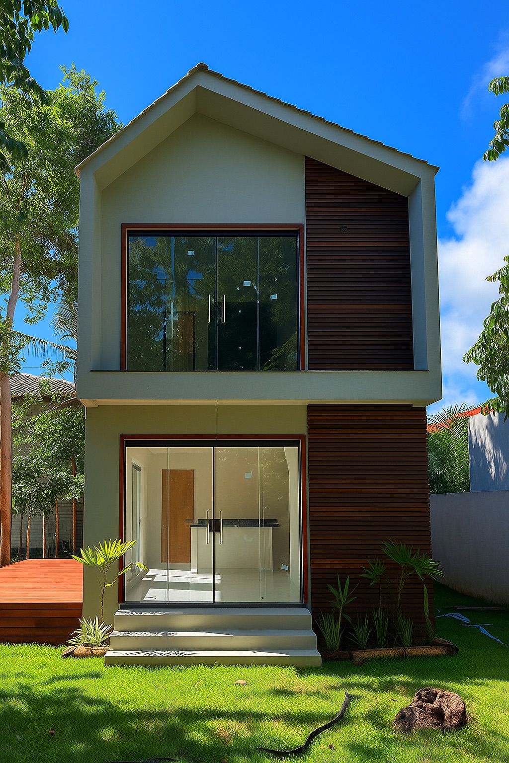 • Fachada moderna com revestimento em madeira ripada e amplas portas de vidro, que garantem iluminação natural e integração com o jardim.