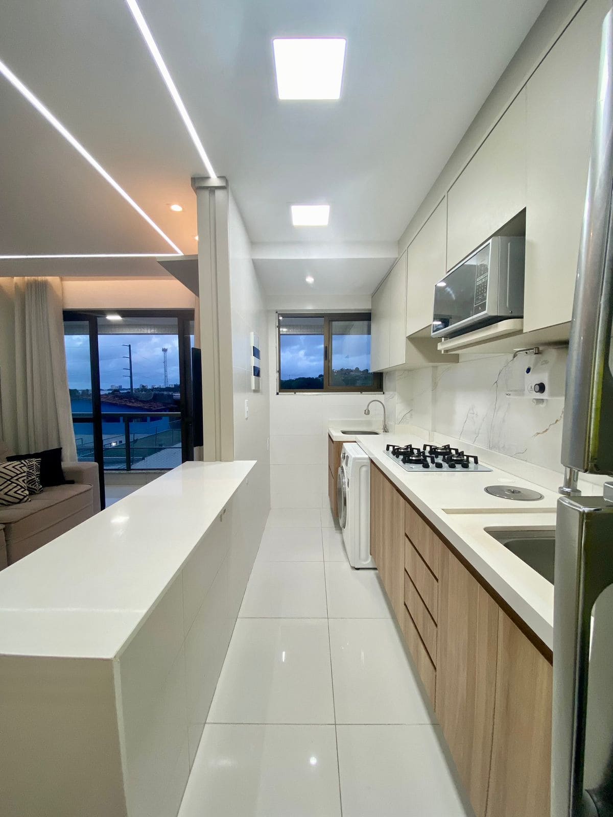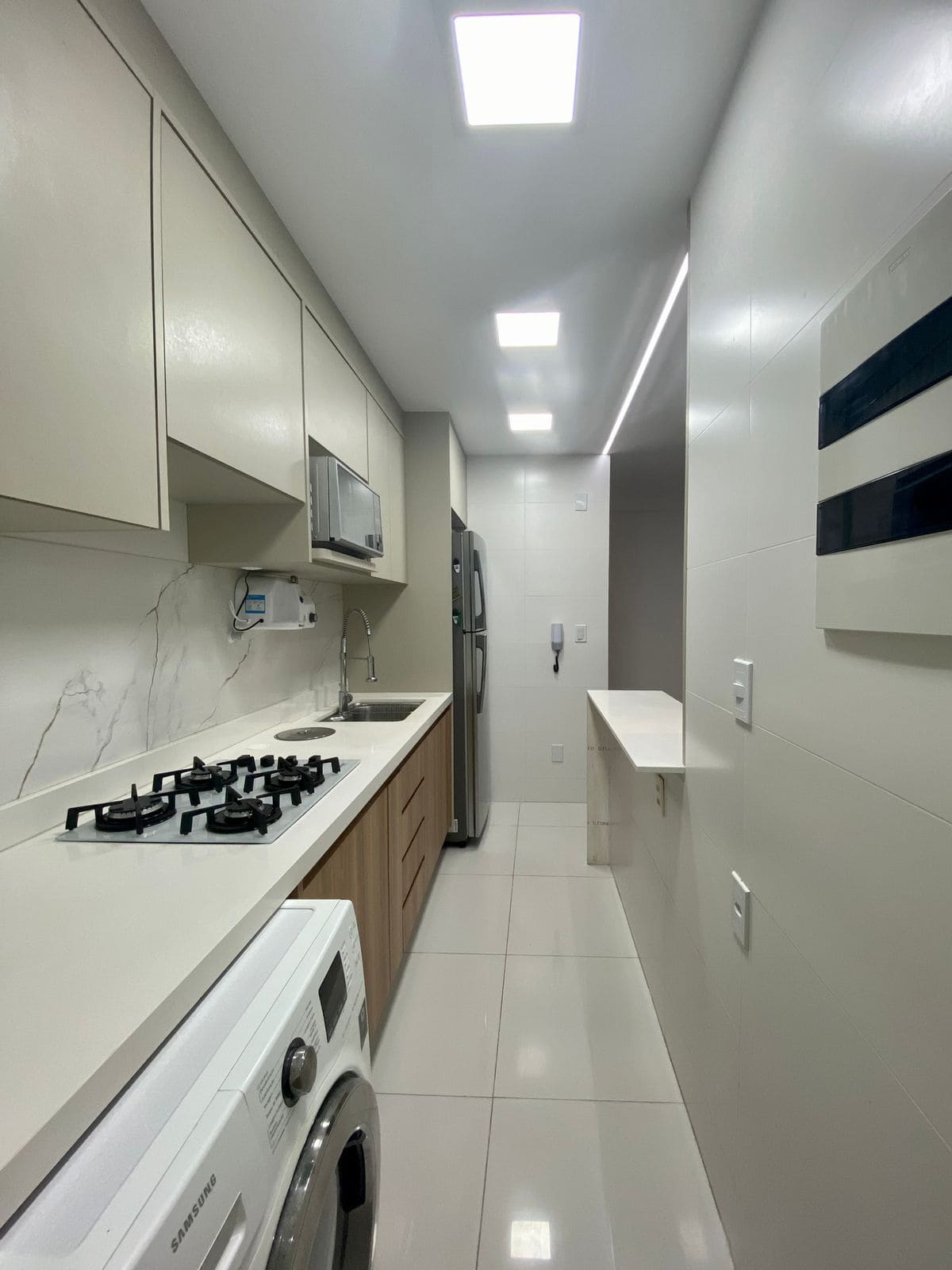 – cozinha com planejados, fogão cooktop, forno, bancada e balcão em quartzo e, cuba inox